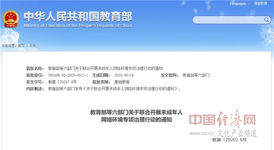 教育部等六部门关于联合开展未成年人网络环境专项治理行动的通知