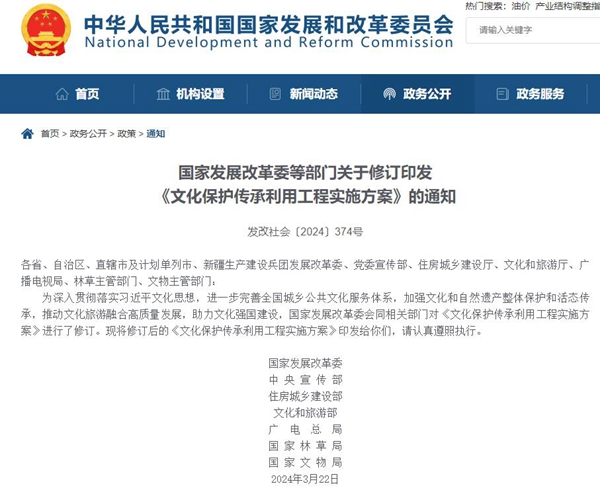中国经济网北京4月8日讯(记者 成琪)据国家发改委网站4月7日消息,为进一步完善全国城乡公共文化服务体系,加强文化和自然遗产整体保护和活态传承,推动文化旅游融合高质量发展,助力文化强国建设,国家发展改革委会同相关部门对《文化保护传承利用工程实施方案》(以下简称“《方案》”)进行了修订。《方案》明确,要依托国家级资源新建或改扩建一批重大文化设施,提升公共文化服务水平,促进优秀传统文化和宝贵自然遗产整体保护和活态传承,推动高质量发展和创造高品质生活相得益彰。