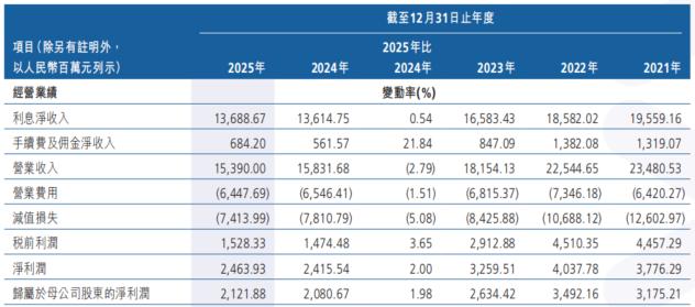 从细分业务看,2025年,作为该行收入支柱的利息净收入为136.89亿元,同比微增0.54%,占营收比例达88.95%;手续费及佣金净收入同比增长21.84%至6.84亿元,绝对规模仍处于近十年低位,占营业收入的比重为4.45%。