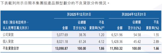 然而,在个人端,不良率急速攀升成为了新的风险隐患。数据显示,2020年末至2025年末,该行不良个人贷款率从1.09%攀升至4.12%,个人不良贷款余额更是从15.33亿元激增至80.21亿元,5年间增长了4.23倍。