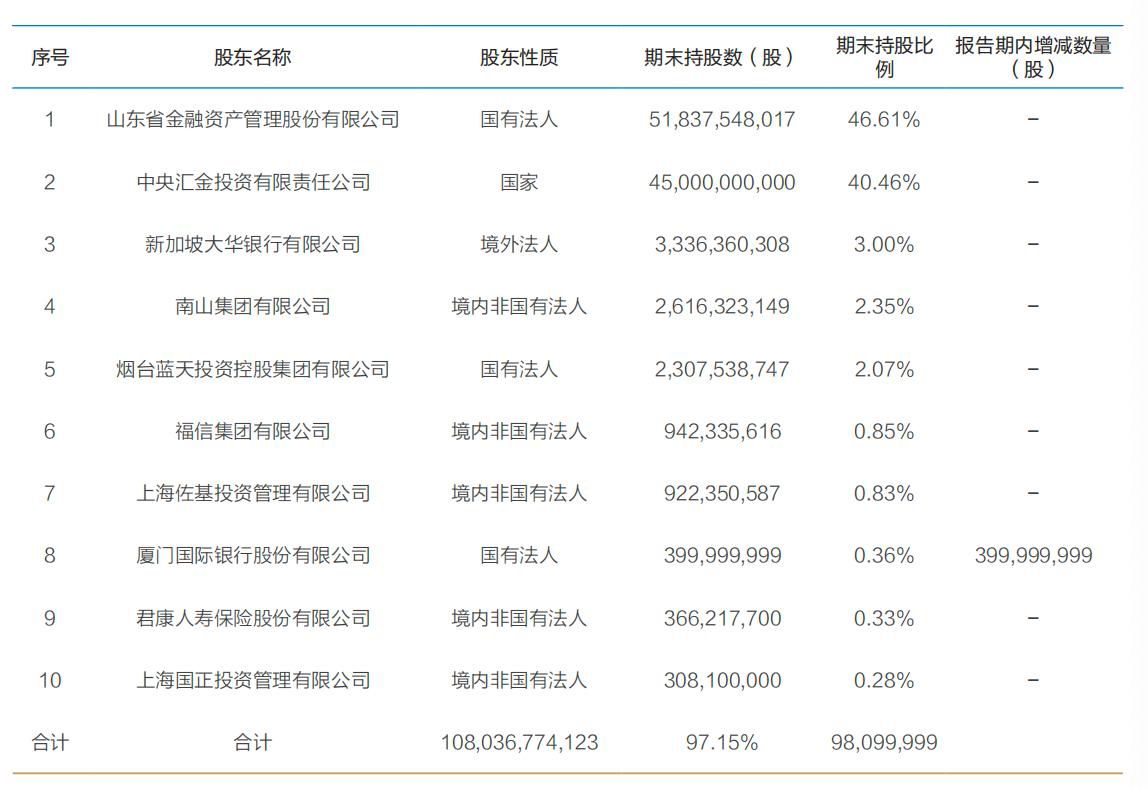 前十大股东情况还显示,目前山东省金融资产管理股份有限公司和中央汇金分别持有恒丰银行46.61%、40.46%股份。新加坡大华银行持股3%,为第三大股东。