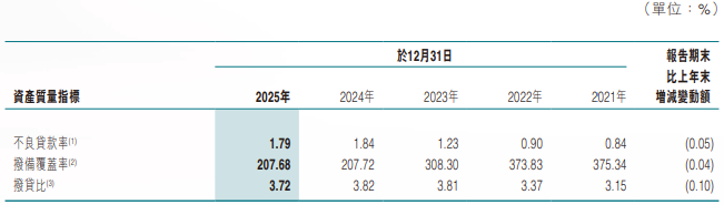 截至2025年12月31日,东莞农商银行的不良贷款率为1.79%,比上年末降低0.05个百分点。