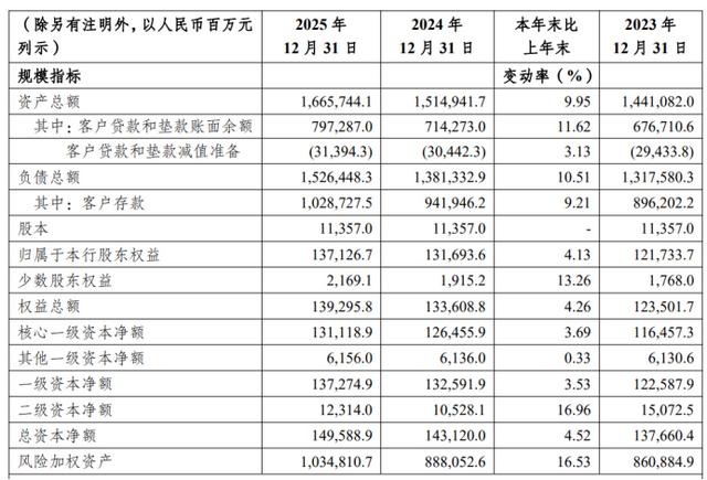 报告显示,截至2025年年末,渝农商行资产规模16657.44 亿元,较上年末增加1508.02亿元,较上年末增长9.95%,增速创近四年新高。其中,存款余额10287.28 亿元,较上年末增加867.81亿元,增幅为9.21%;贷款余额7972.87亿元,较上年末增加830.14亿元,增长11.62%。