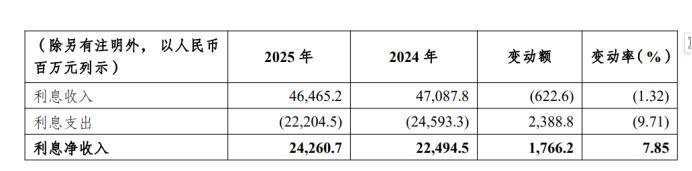 报告显示,2025 年,渝农商行实现利息收入464.65亿元,同比减少6.23亿元,降幅1.32%。渝农商行表示,主要受市场利率下调影响。2025年,客户贷款和垫款利息收入274.84亿元,同比减少0.20亿元,降幅0.07%。2025年,金融投资利息收入149.70亿元,同比减少8.15亿元,降幅5.16%。渝农商行在报告中表示,主要是资金市场利率下行,本集团金融投资收益率下降。