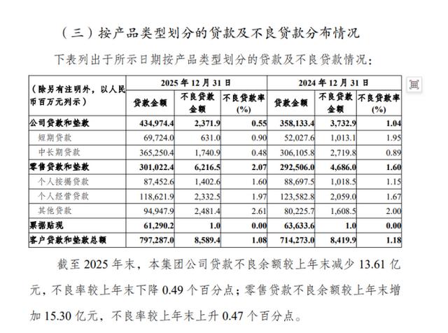 零售贷款不良余额增加15.3亿,零售贷款不良率上行47个基点