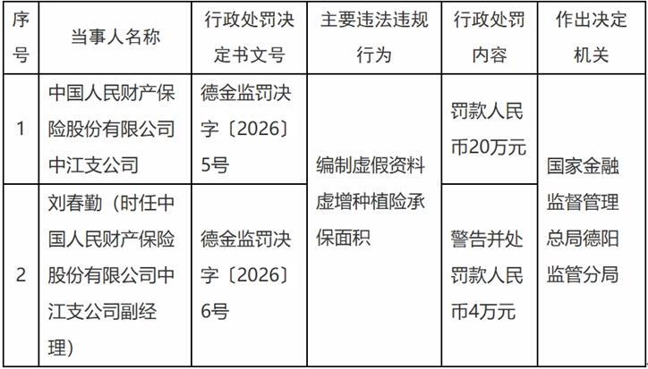 国家金融监督管理总局德阳监管分局对机构罚款人民币20万元;对时任中国人民财产保险股份有限公司中江支公司副经理刘春勤给予警告并处罚款人民币4万元。
