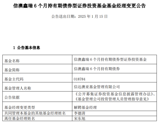 中国经济网北京1月15日讯 今日,信达澳亚基金管理有限公司公告称,宋东旭离任信澳鑫瑞6个月持有期债券(A类018784;C类018785)。