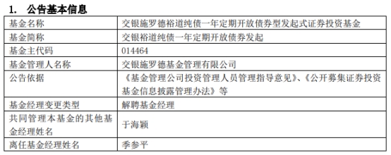 季参平离任交银裕道纯债一年定期开放债券发起
