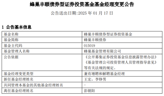 蜂巢丰颐债券增聘王宏与李铮男 彭朝阳离任