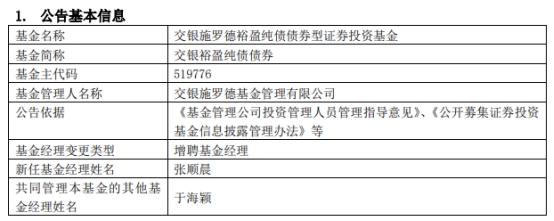 中国经济网北京1月17日讯 今日,交银施罗德基金管理有限公司公告称,交银裕盈纯债债券(A类519776;C类519777;D类020344)增聘基金经理张顺晨。