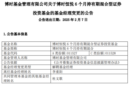 中国经济网北京2月7日讯 今日,博时基金管理有限公司公告称,李重阳离任博时恒悦6个月持有期混合(A类011527、C类011528)。