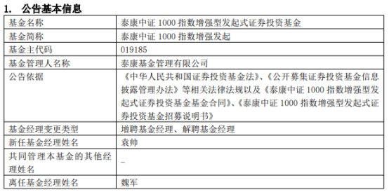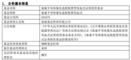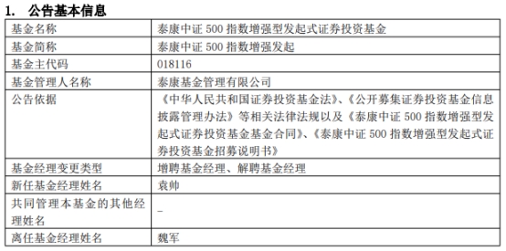 泰康基金3只基金增聘袁帅 魏军离任