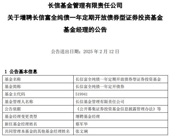 中国经济网北京2月12日讯 今日,长信基金管理有限责任公司公告称,长信富全纯债一年定开债券(A类519941;C类519940)增聘基金经理蔡军华。