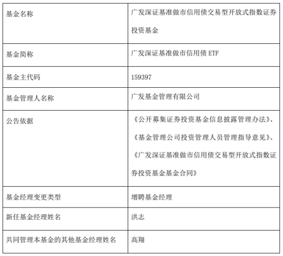中国经济网北京2月13日讯 今日,广发基金管理有限公司公告称,广发深证基准做市信用债ETF(159397)增聘基金经理洪志。