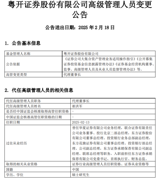 中国经济网北京2月19日讯 昨日,粤开证券股份有限公司发布高级管理人员变更公告。公告称,任命崔洪军为代理董事长。