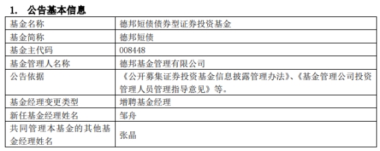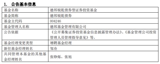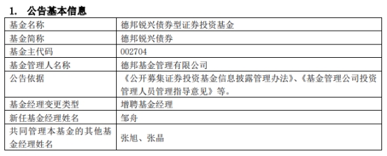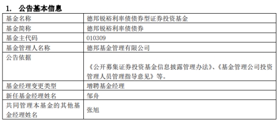 中国经济网北京2月20日讯 今日,德邦基金管理有限公司公告称,德邦锐兴债券、德邦短债、德邦锐乾债券、德邦锐裕利率债债券增聘基金经理邹舟。