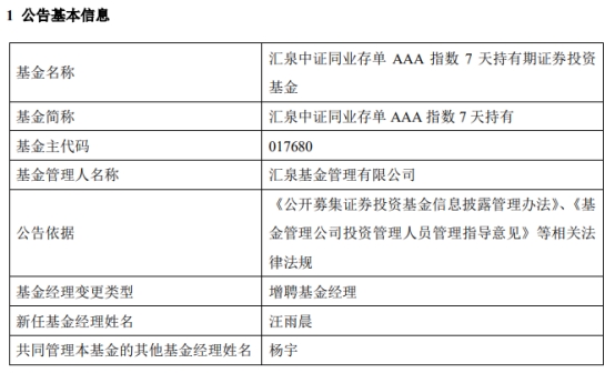 汇泉中证同业存单AAA指数7天持有增聘汪雨晨