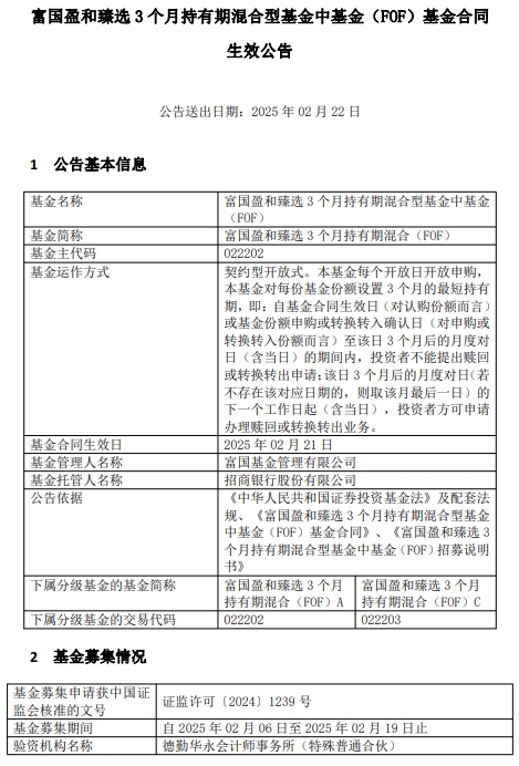 中国经济网北京2月24日讯 近日,富国基金管理有限公司发布富国盈和臻选3个月持有期混合型基金中基金(FOF)基金合同生效公告。