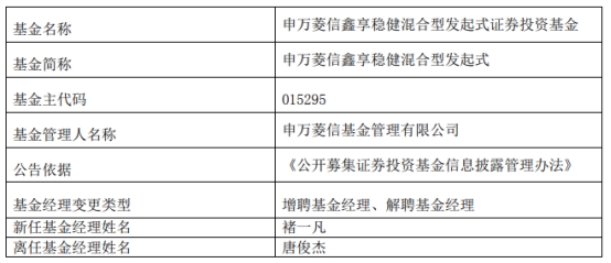 申万菱信鑫享稳健混合型发起式、申万菱信双利混合增聘基金经理褚一凡。褚一凡2017年起从事金融相关工作,曾任职于浙商证券股份有限公司,2019年11月加入申万菱信基金,现任基金经理。