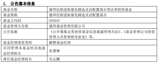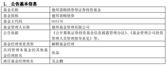 中国经济网北京2月25日讯 今日,德邦基金管理有限公司公告称,吴志鹏离任德邦民裕进取量化精选灵活配置混合(A类005947;C类005948)、德邦景颐债券(A类003176;C类003177;D类021024;E类021025)。