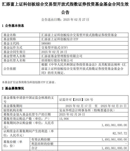 汇添富上证科创板综合ETF成立 规模14.93亿元