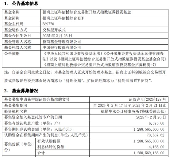 中国经济网北京2月27日讯 今日,招商基金管理有限公司发布招商上证科创板综合交易型开放式指数证券投资基金基金合同生效公告。