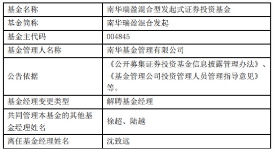 沈致远离任南华瑞盈混合发起