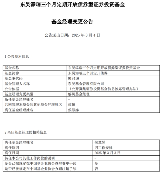侯慧娣离任东吴添瑞三个月定开债券