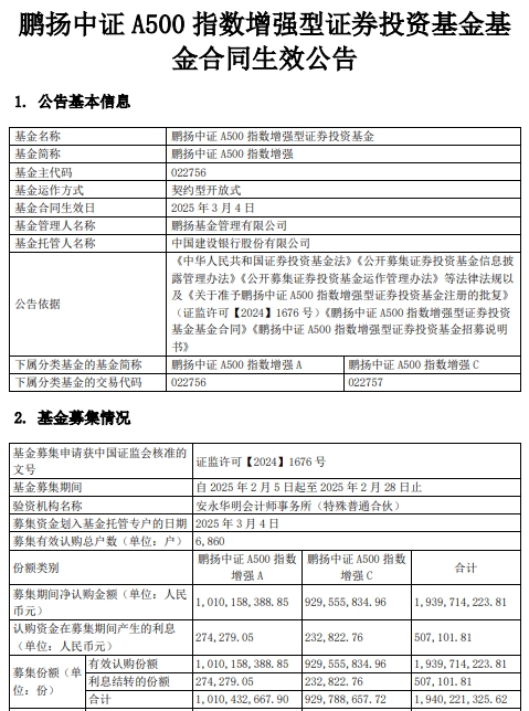 鹏扬中证A500指数增强成立 规模19亿元