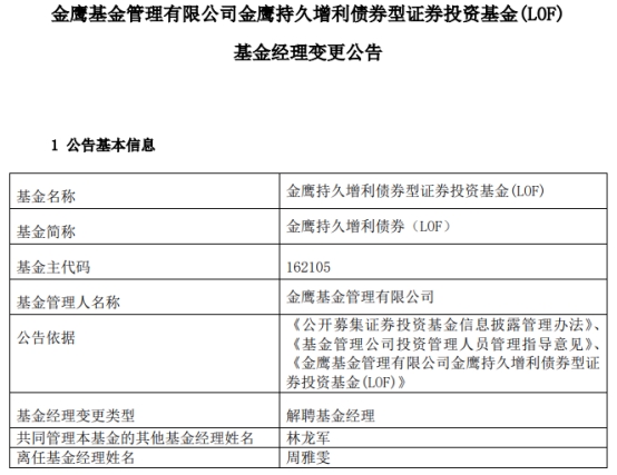 周雅雯离任金鹰持久增利债券(LOF)