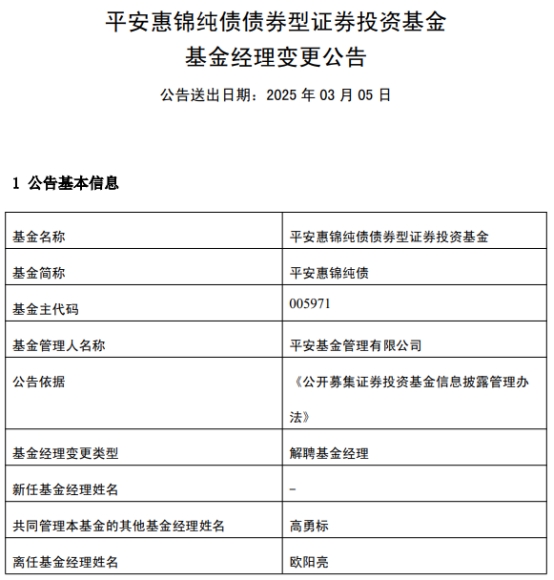 中国经济网北京3月5日讯 今日,平安基金管理有限公司公告称,欧阳亮离任平安惠锦纯债(A类005971;C类021155)。