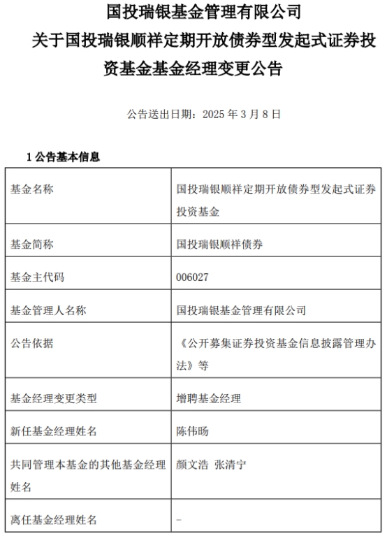 国投瑞银顺祥债券增聘陈伟旸