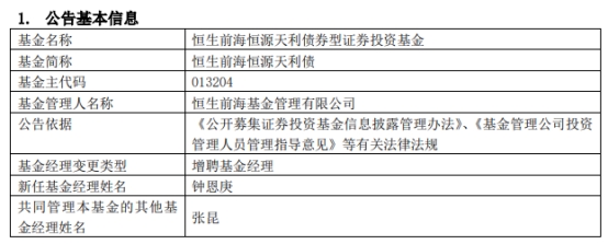 中国经济网北京3月14日讯 今日,恒生前海基金管理有限公司公告称,恒生前海恒源天利债(A类013204;C类013205)增聘基金经理钟恩庚。