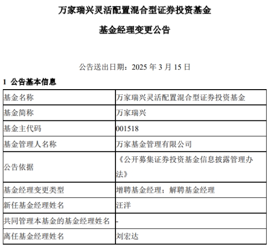 万家瑞兴增聘汪洋 刘宏达离任