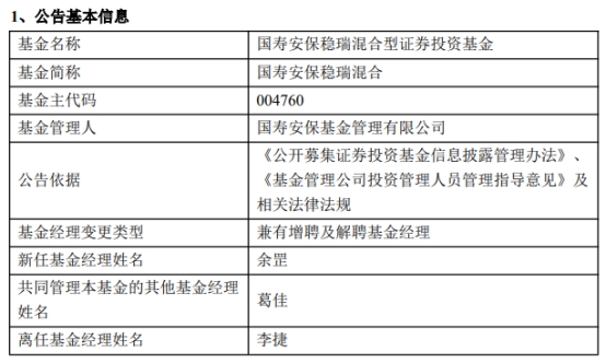 中国经济网北京3月18日讯 今日,国寿安保基金管理有限公司公告称,国寿安保稳瑞混合(A类004760;C类004761)、国寿安保裕安混合(A类010205;C类010206)增聘基金经理余罡,李捷离任国寿安保稳瑞混合。