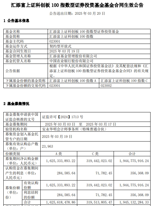 汇添富上证科创板100指数成立 规模19.4亿元