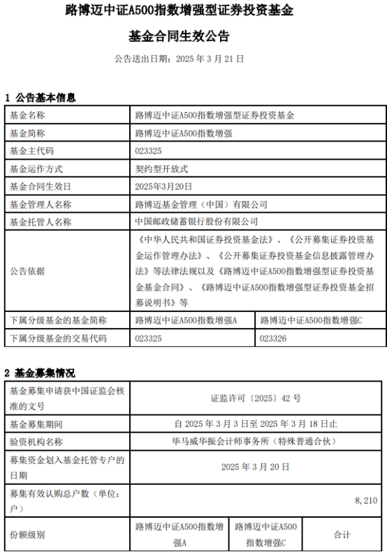 中国经济网北京3月21日讯 今日,路博迈基金管理(中国)有限公司发布路博迈中证A500指数增强型证券投资基金基金合同生效公告。