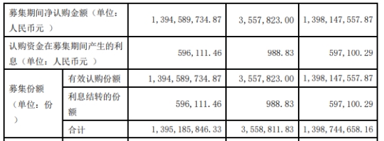 该基金募集期间净认购金额合计1,398,147,557.87元,认购资金在募集期间产生的利息合计597,100.29元,募集份额合计1,398,744,658.16份。