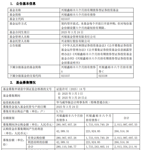 兴银鑫裕丰六个月持有债券成立 规模20亿元