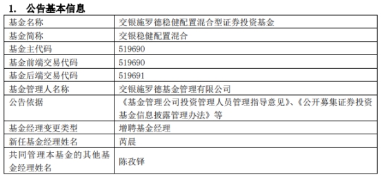 中国经济网北京3月25日讯 今日,交银施罗德基金管理有限公司公告称,交银稳健配置混合(前端519690;后端519691)增聘基金经理芮晨。
