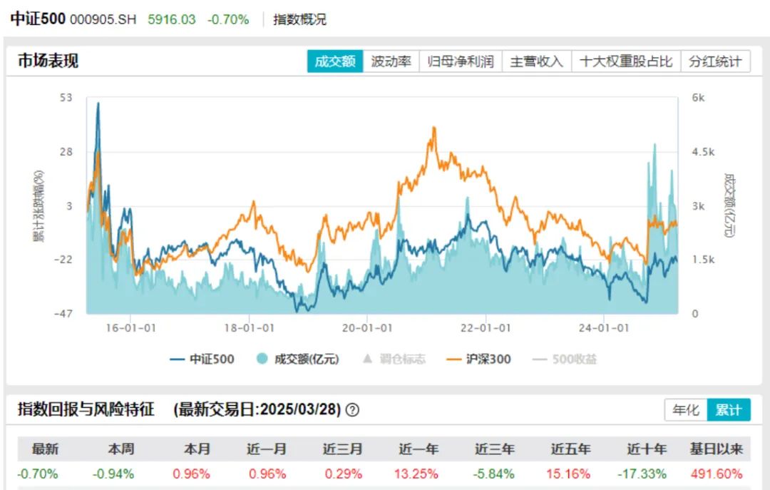 从历史表现来看,截至2025年3月28日,中证500指数基日(2004年12月31日)以来累计收益率为491.6%,年化回报9.46%,显著超越同期沪深300(289.96%)和中证800(324.63%)等指数。