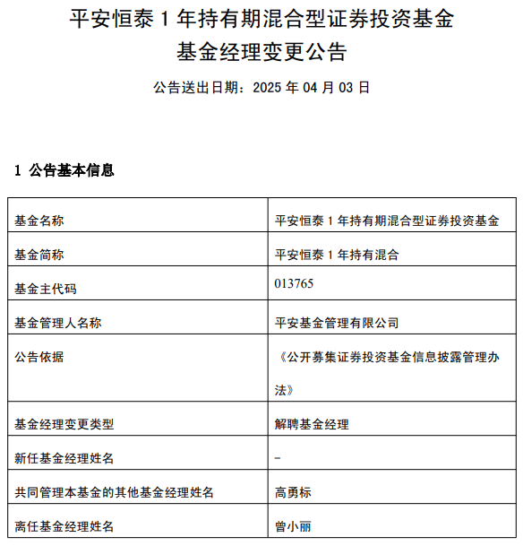 中国经济网北京4月3日讯 今日,平安基金管理有限公司公告称,曾小丽离任平安恒泰1年持有混合(A类013765;C类013766)。