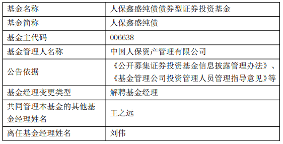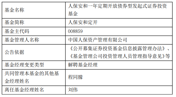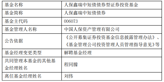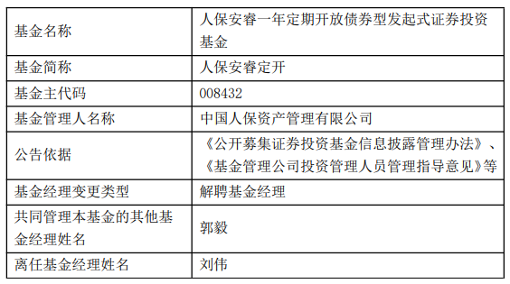 中国经济网北京4月7日讯 今日,中国人保资产管理有限公司公告称,刘伟离任人保安睿定开(008432)、人保鑫盛纯债(A类006638;C类006639;E类022593)、人保鑫瑞中短债债券(A类006073;C类006074;E类022591)、人保安和定开(008859)。