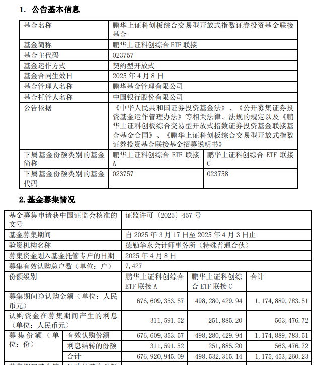 鹏华上证科创综合ETF联接成立 募集净额11.7亿元