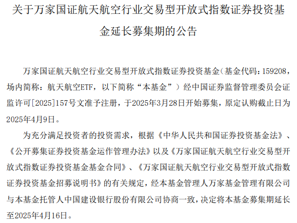 公告称,万家国证航天航空行业交易型开放式指数证券投资基金(基金代码:159208,场内简称:航天航空ETF)于2025年3月28日开始募集,原定认购截止日为2025年4月9日,现决定将该基金募集期延长至2025年4月16日。