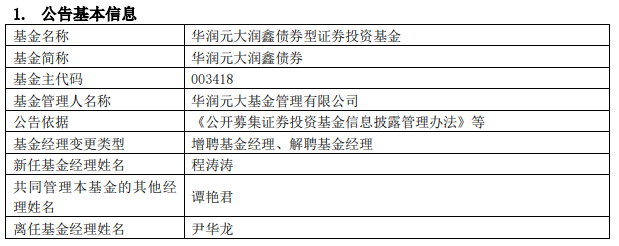 华润元大泓远利率债增聘程涛涛 尹华龙离任