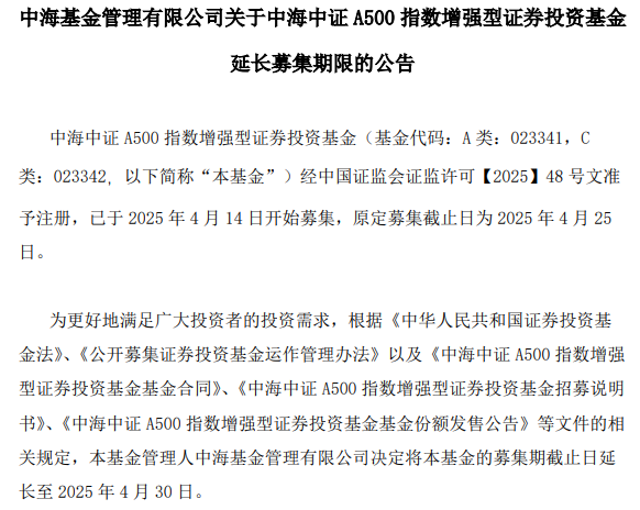 公告称,中海中证A500指数增强(基金代码:A类:023341,C类:023342)于2025年4月14日开始募集,原定募集截止日为2025年4月25日,现决定将该基金的募集期截止日延长至2025年4月30日。
