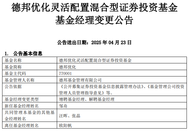 德邦优化灵活配置混合增聘邹舟 欧阳帆离任