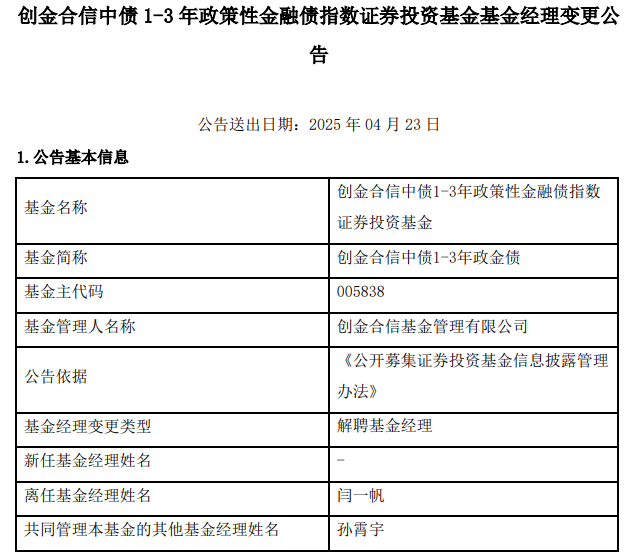 闫一帆离任创金合信中债1-3年政金债