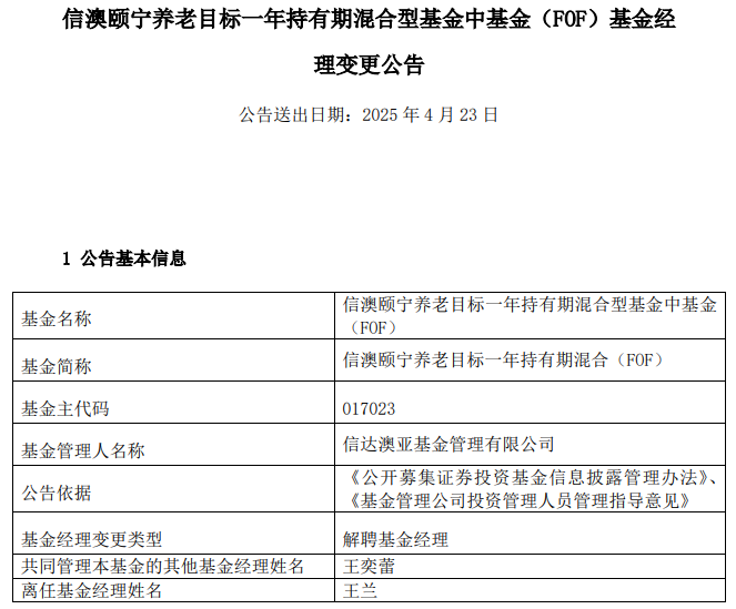 中国经济网北京4月23日讯 今日,信达澳亚基金管理有限公司公告称,王兰离任信澳颐宁养老目标一年持有期混合(FOF)(A类017023;Y类019779)。